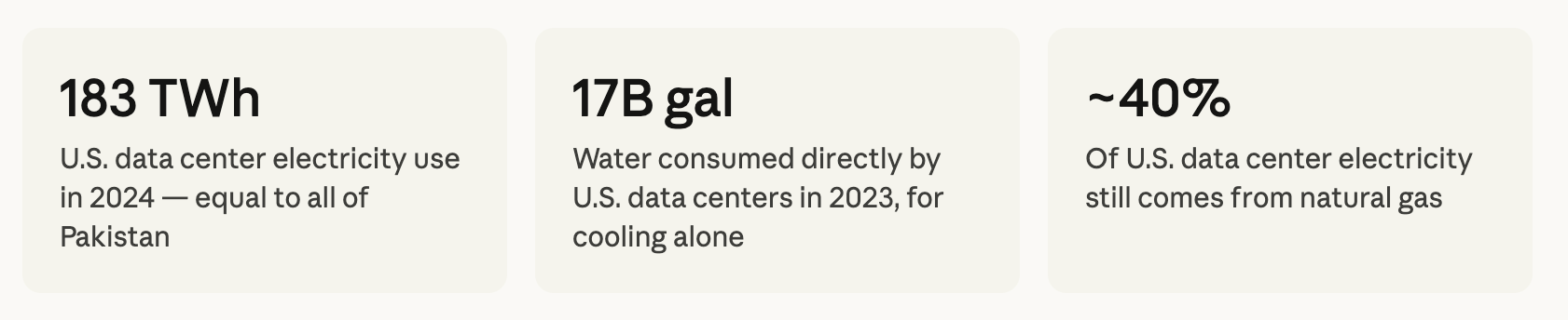 A single Google data center in Council Bluffs, Iowa used 1 billion gallons of water in 2024, enough to supply all of Iowa’s residential water for five days. And fewer than a third of data center operators even track their water usage.